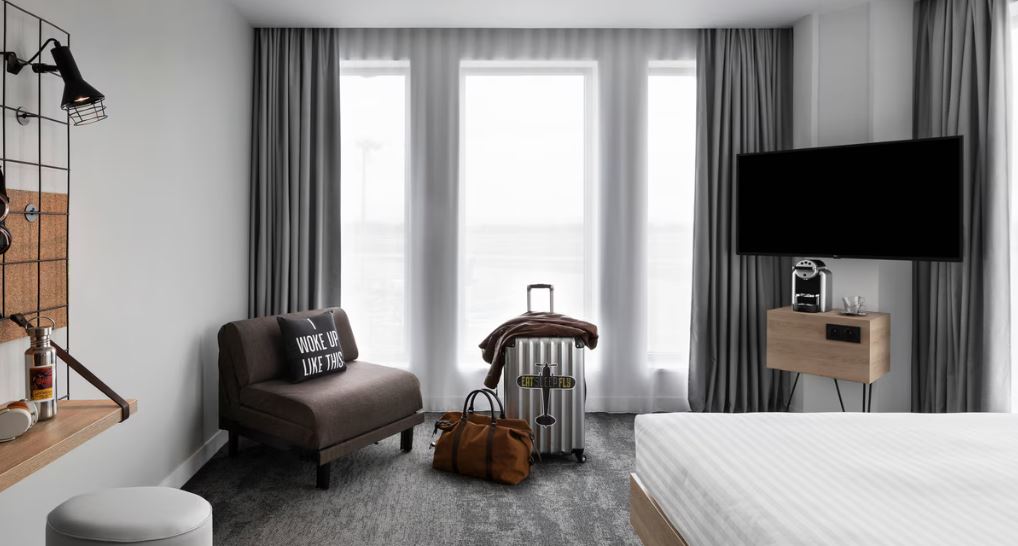 Located in the heart of Terminal 2 of Lyon Saint-Exupéry Airport, Moxy Lyon Airport is just a few steps from the boarding gates and just a few minutes from Lyon Saint-Exupéry TGV station. The 123 connected rooms offer modern decoration and everything you need for your stopover in Lyon. Our ''Plug & Meet'' offer allows you to organize connected meetings while taking advantage of all the necessary technology. In case of a small hunger, come and try our selection of delicious dishes throughout the day (and night). Enjoy a menu of local beers, wines and cocktails made to order by our Moxy Crew. The Lyon Saint Exupery airport parking is available nearby.