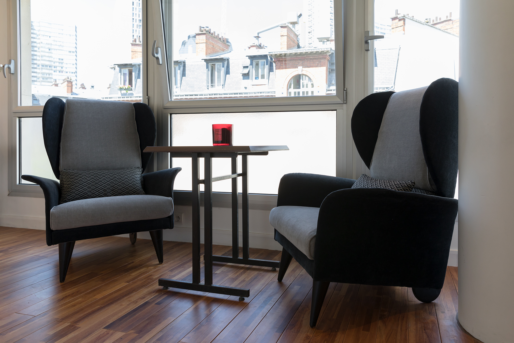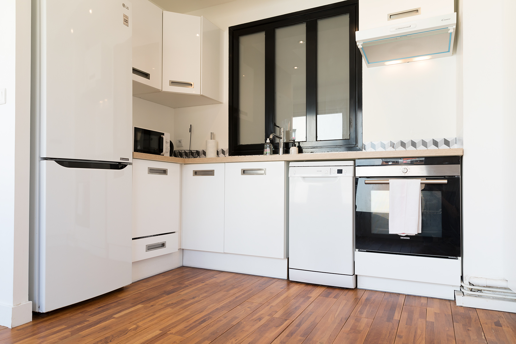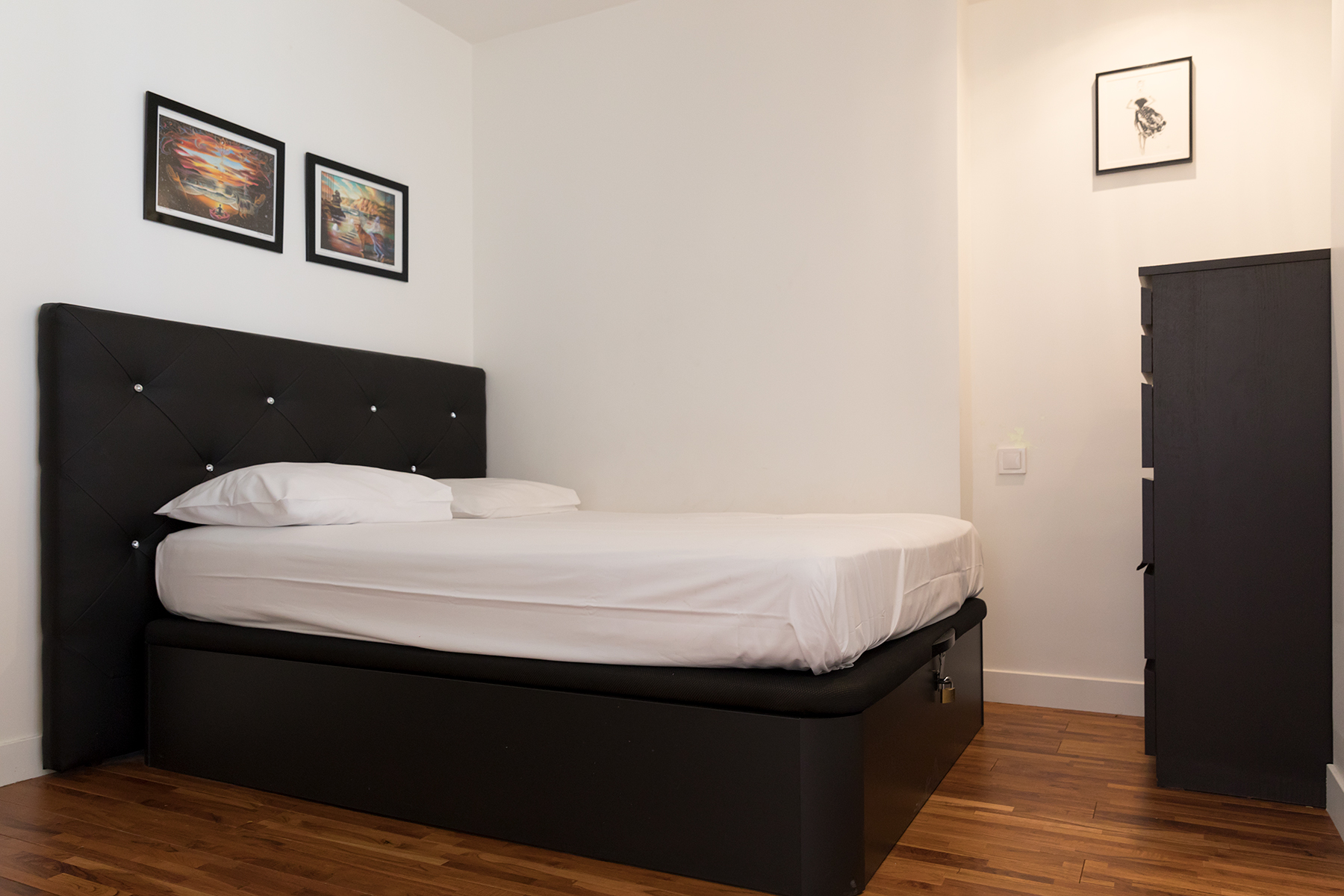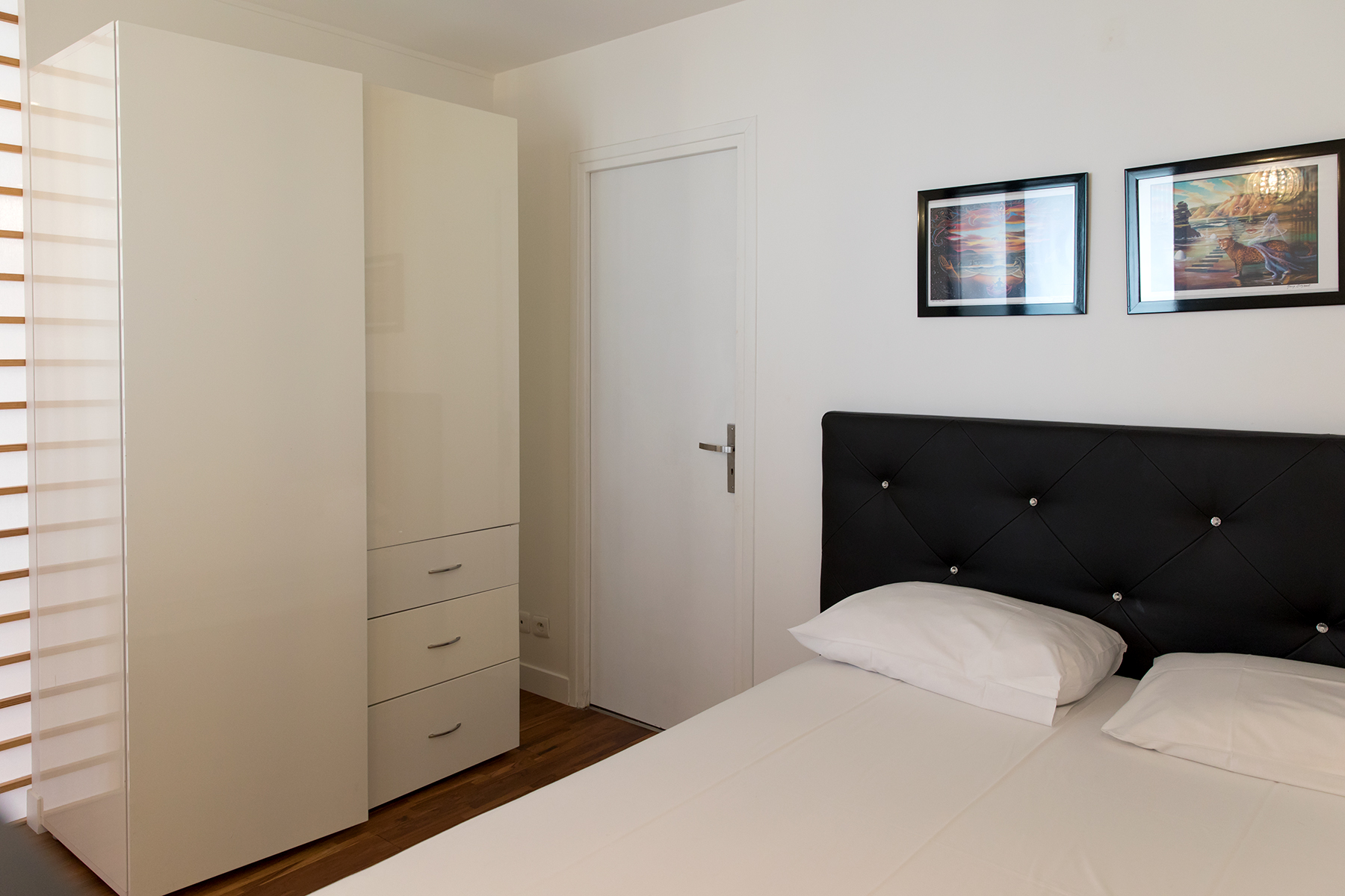 This apartment is located in the heart of the 15th arrondissement a two minute walk from the metro line 10 at Charles Michel. The apartment is located in a modern building complete with elevator and large hallways. Upon entering the apartment guests will be greeted by large bay windows bathing the kitchen and living area in lots of light. The living area has a comfortable sofa and flat screen TV. There is also a dining area for two as guests make their way to the open kitchen. The kitchen was newly renovated and has all the amenities including oven and dishwasher. There is a breakfast nook where you can sip your morning coffee while enjoying the view.