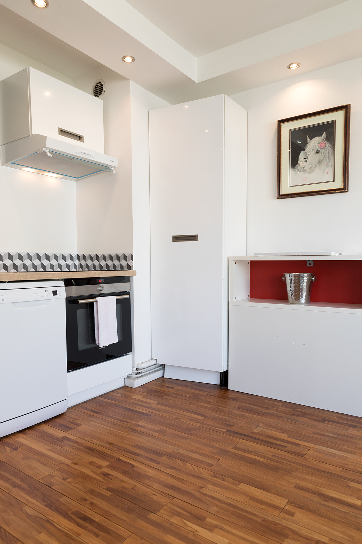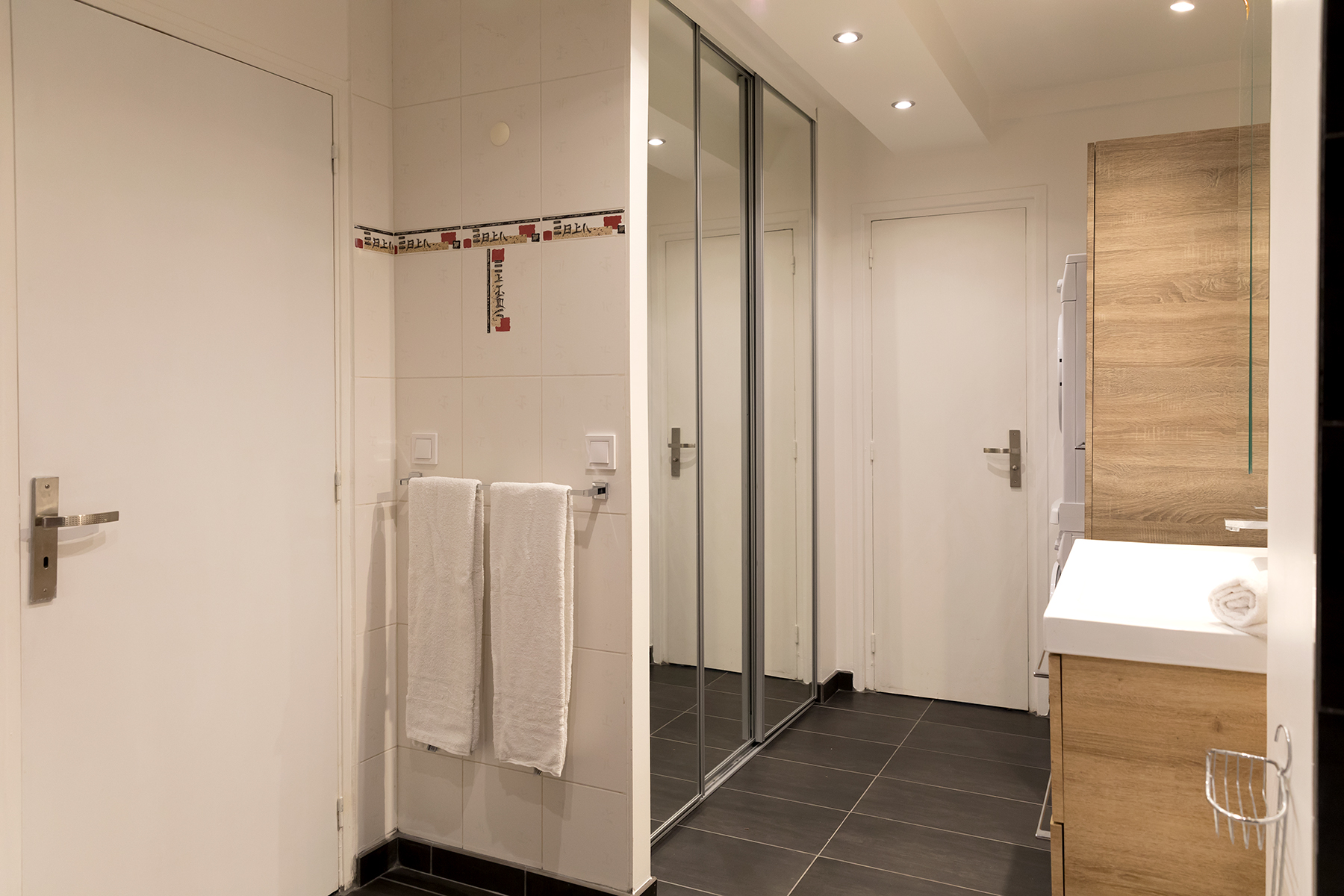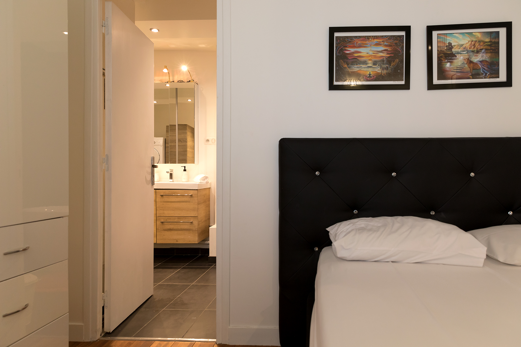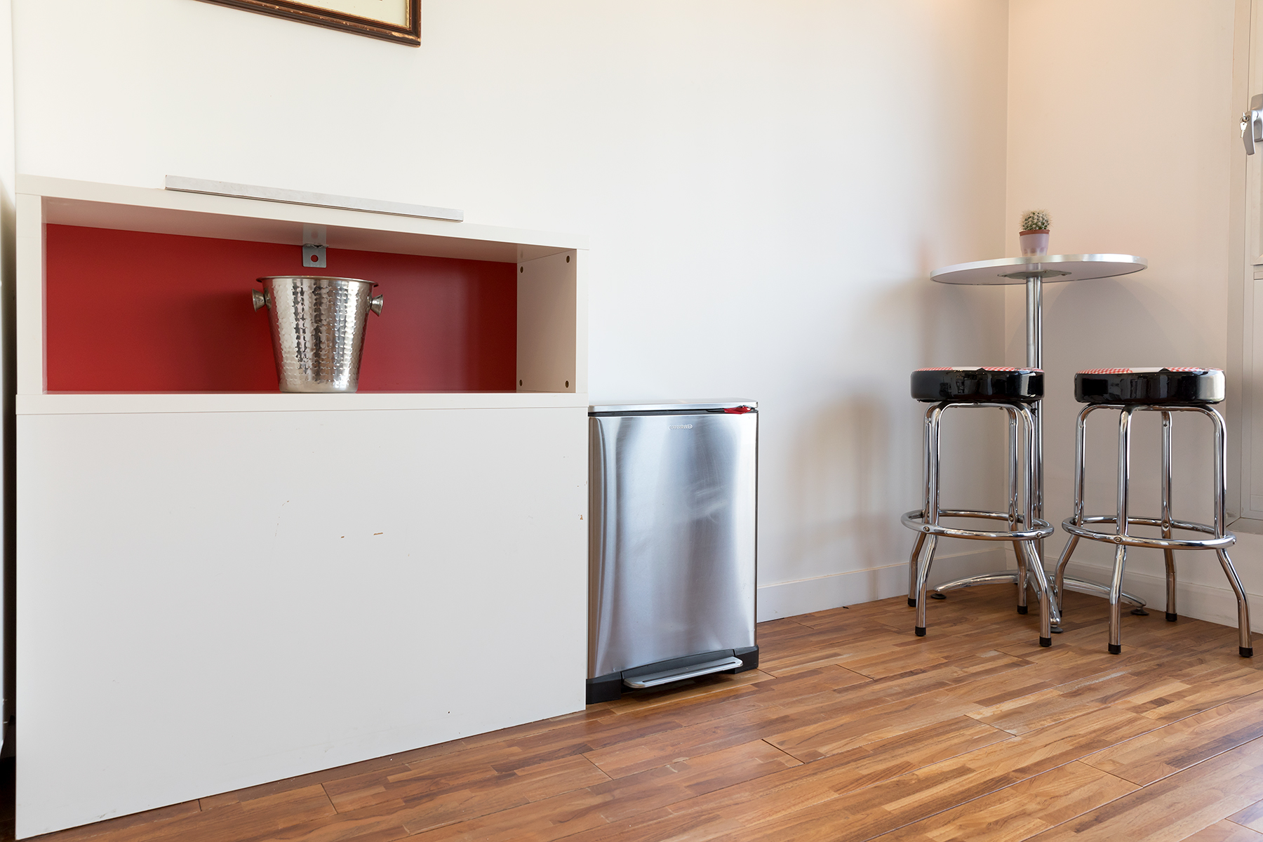 This apartment is located in the heart of the 15th arrondissement a two minute walk from the metro line 10 at Charles Michel. The apartment is located in a modern building complete with elevator and large hallways. Upon entering the apartment guests will be greeted by large bay windows bathing the kitchen and living area in lots of light. The living area has a comfortable sofa and flat screen TV. There is also a dining area for two as guests make their way to the open kitchen. The kitchen was newly renovated and has all the amenities including oven and dishwasher. There is a breakfast nook where you can sip your morning coffee while enjoying the view.