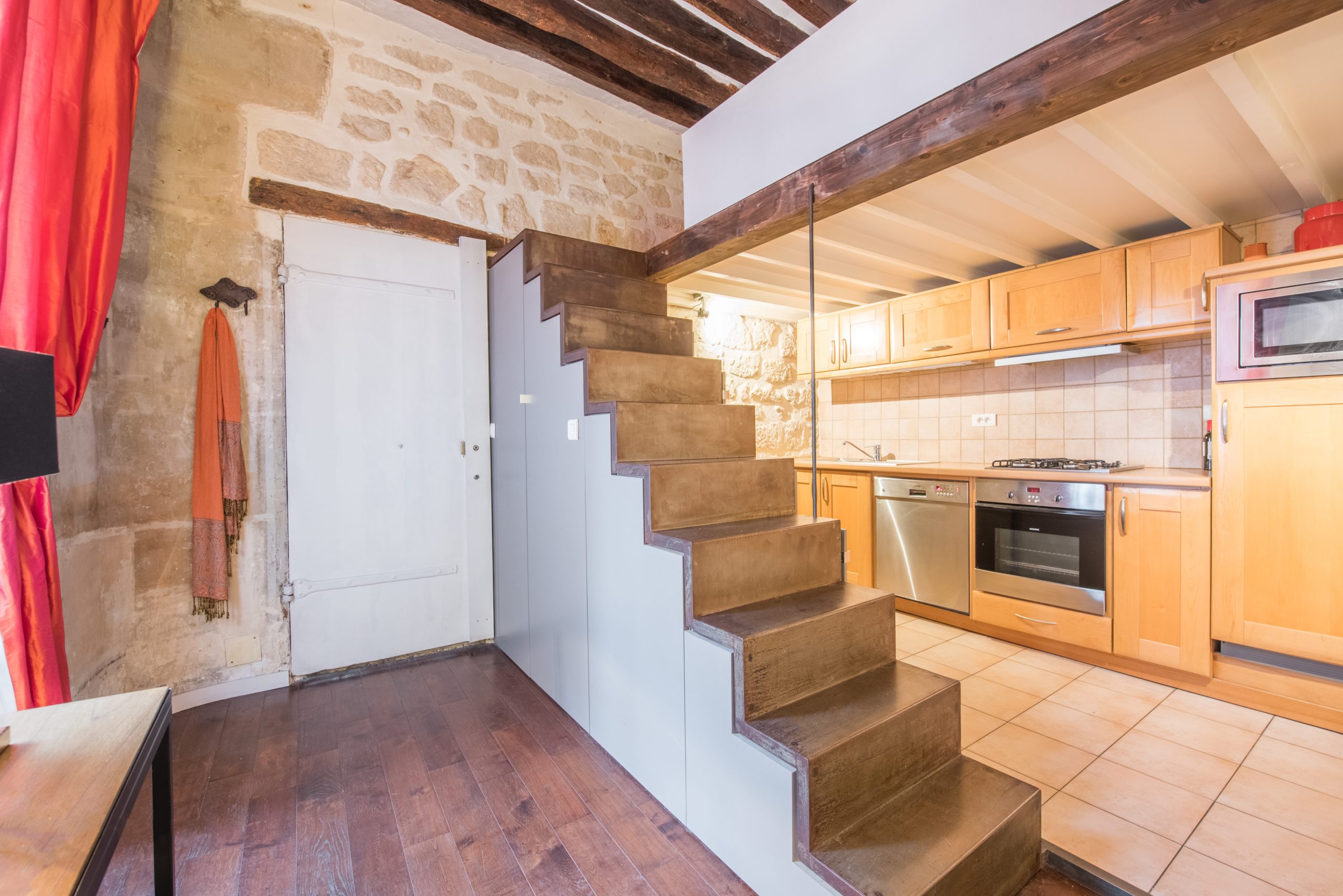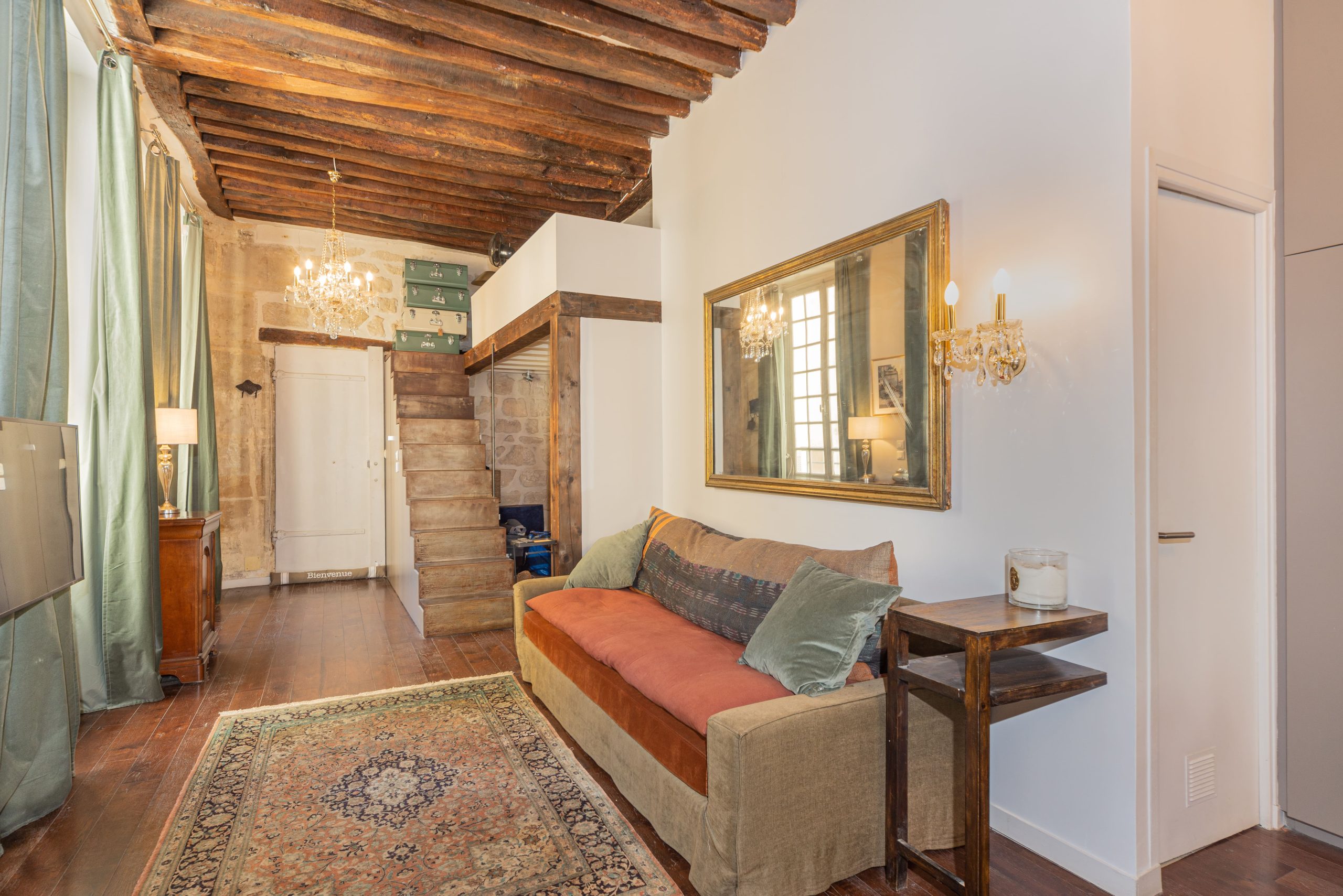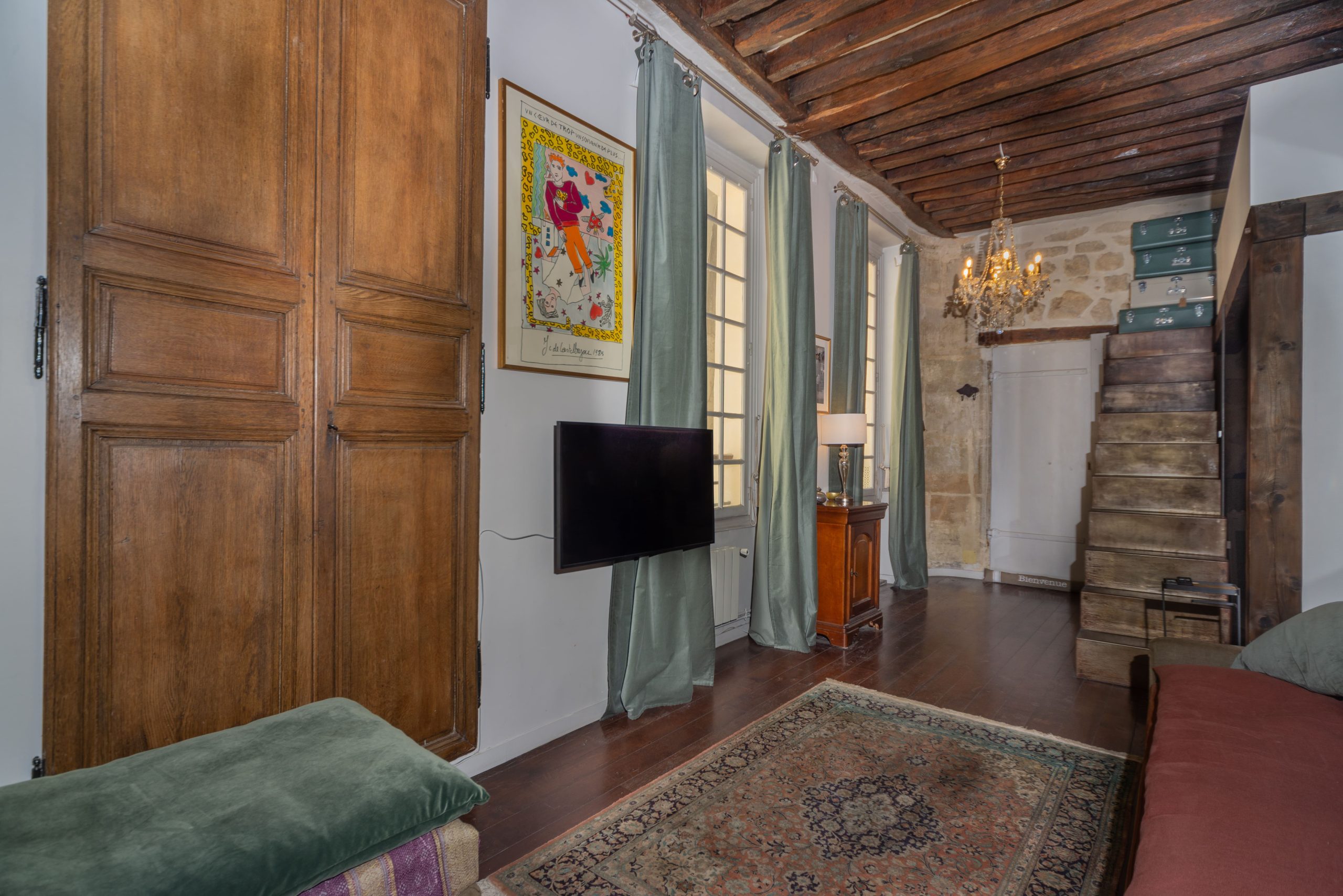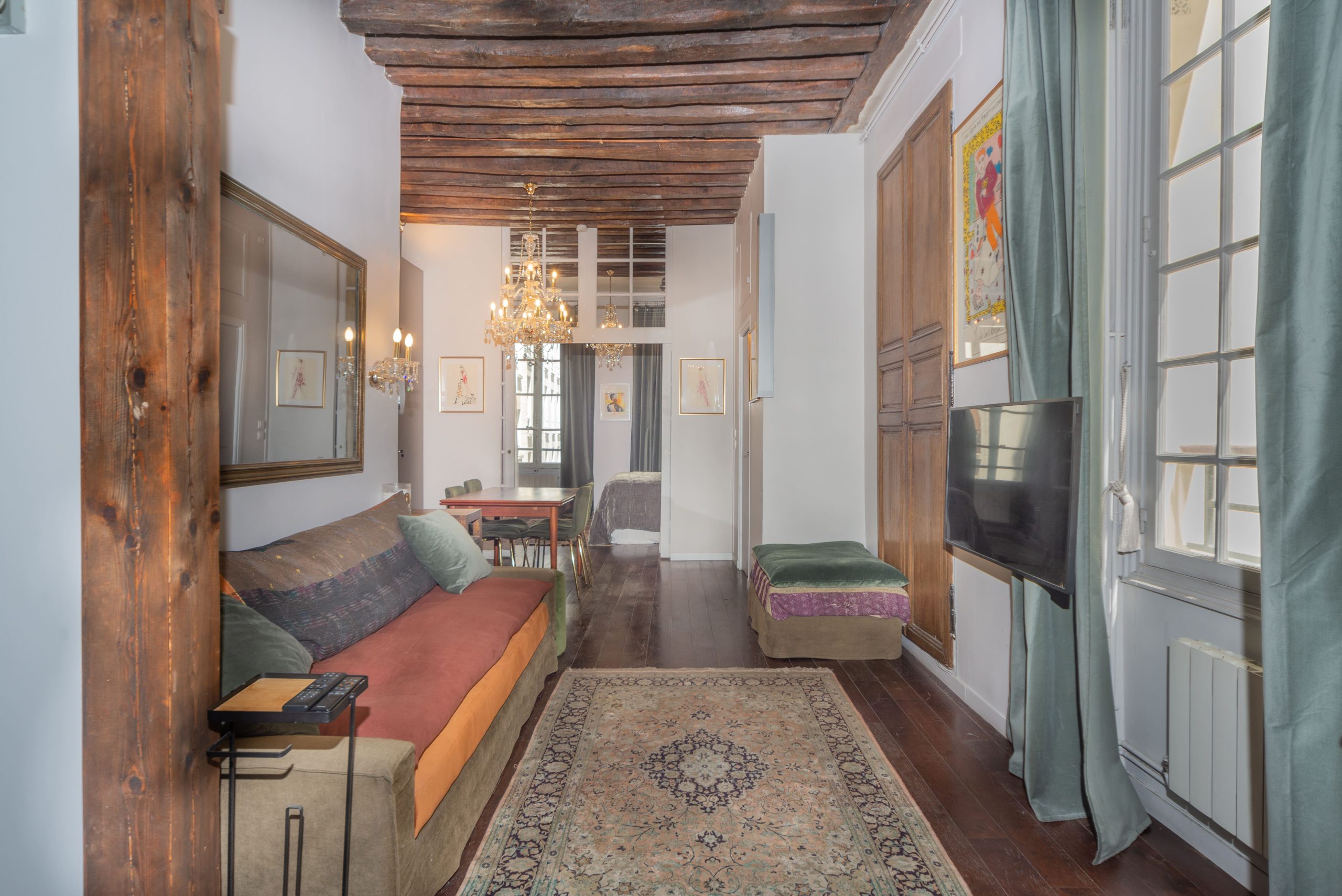 Clementine Marais is a gorgeous typical Parisian 1 Bedroom Apartment centrally located in Le Marais and steps away from Place de Vosges. This 1 Bedroom Apartment is situated in a second floor of a typical 18th century building with stone walls. Once you enter the home you feel you are in a French ''Chateau'' with bare stone walls in the entrance and wooden beams on the ceiling with dark wooden parquet floor.