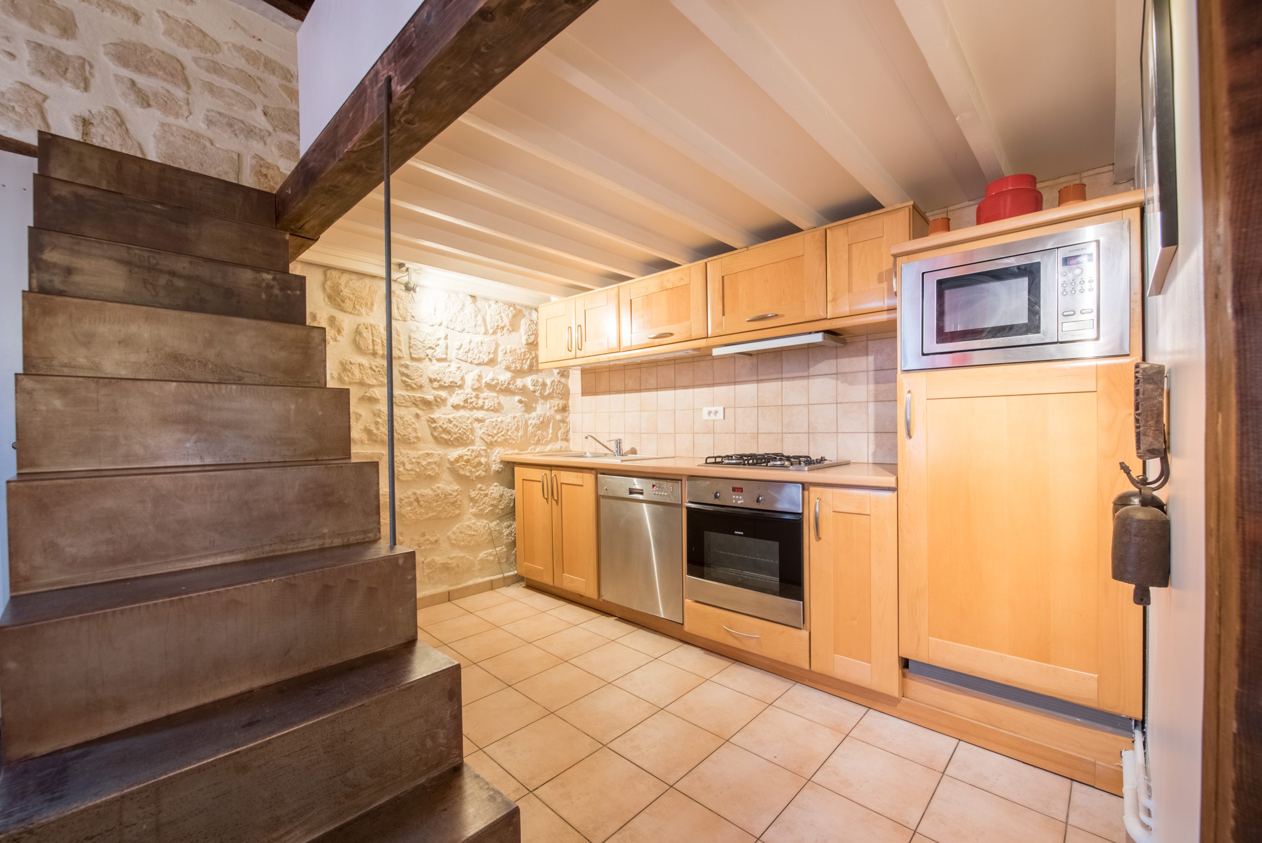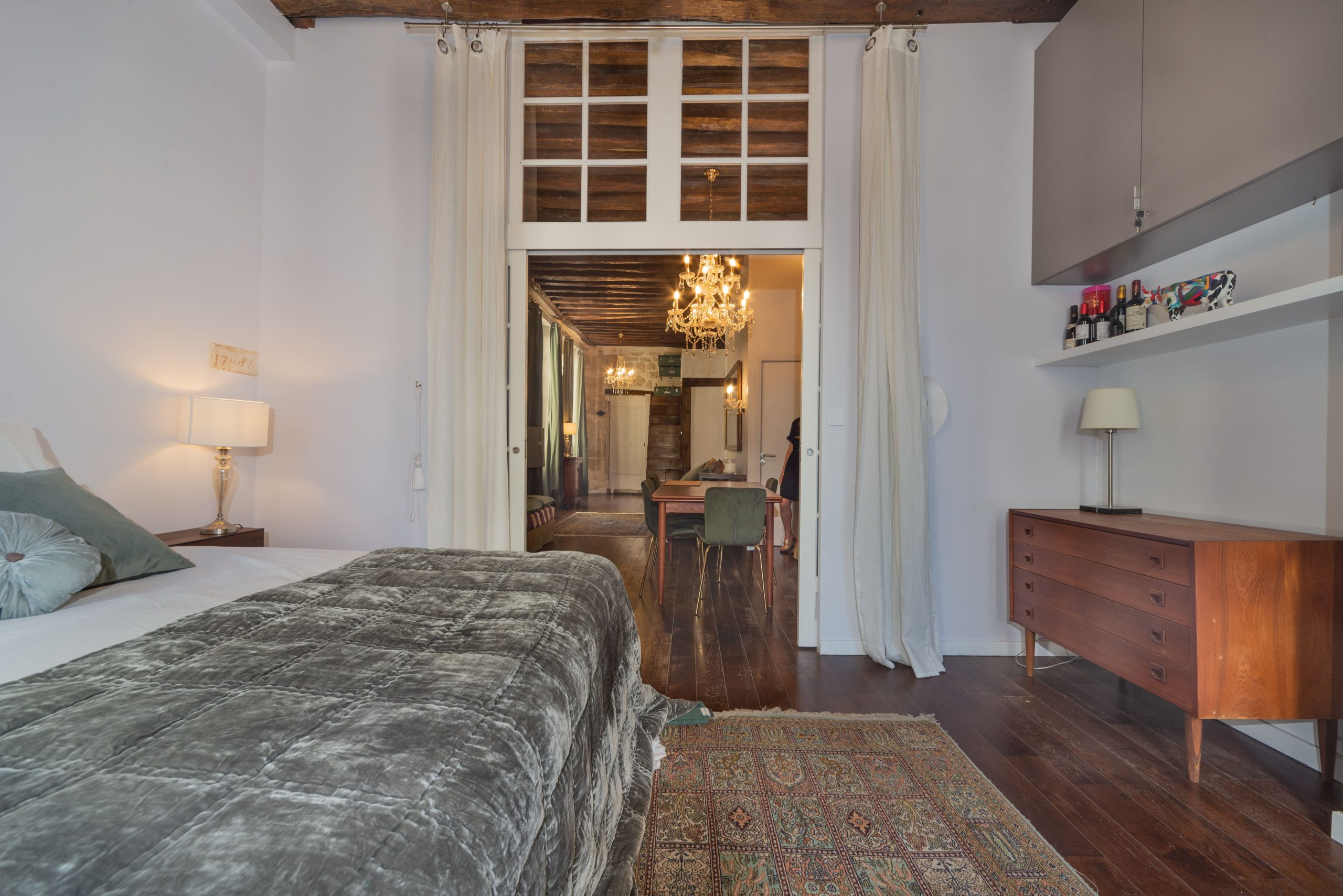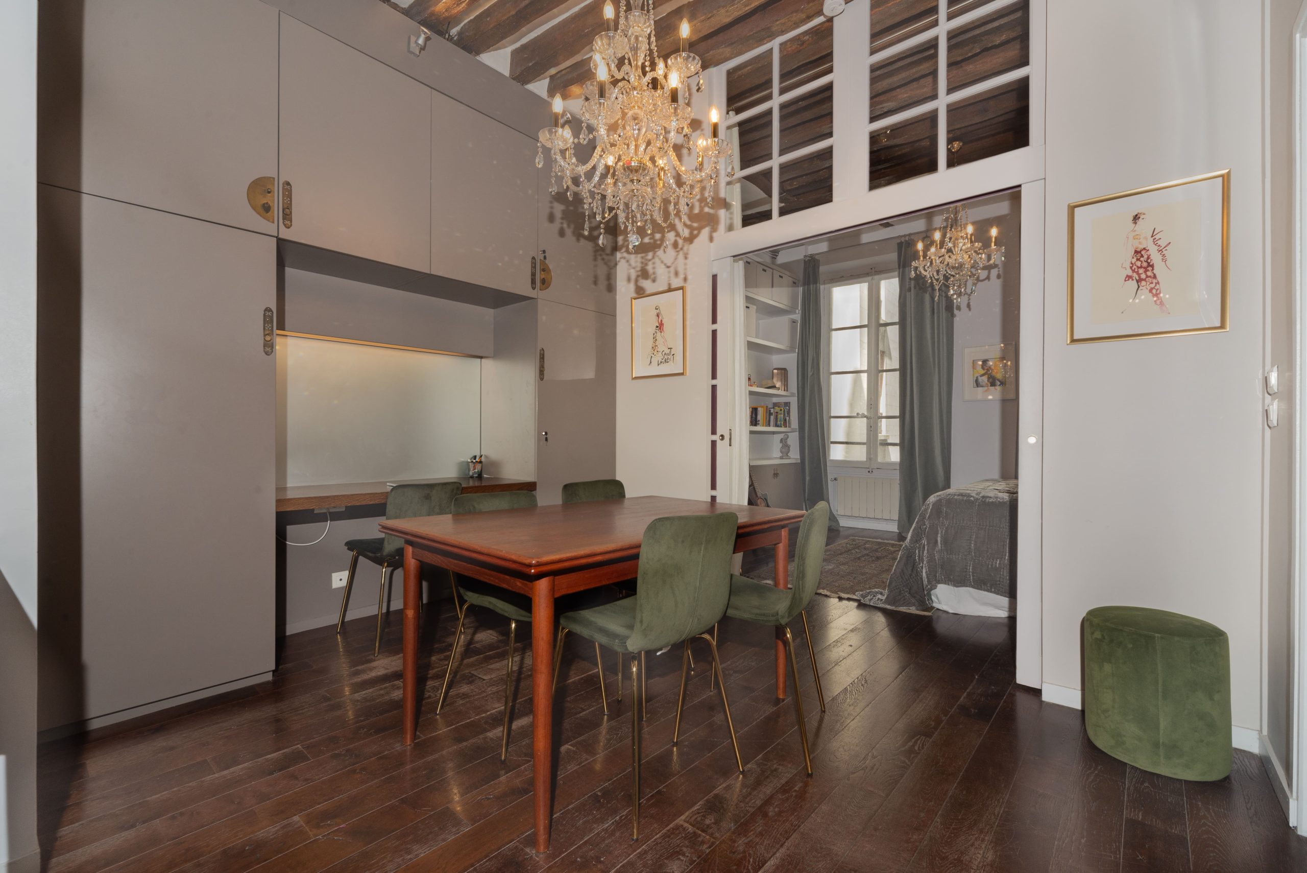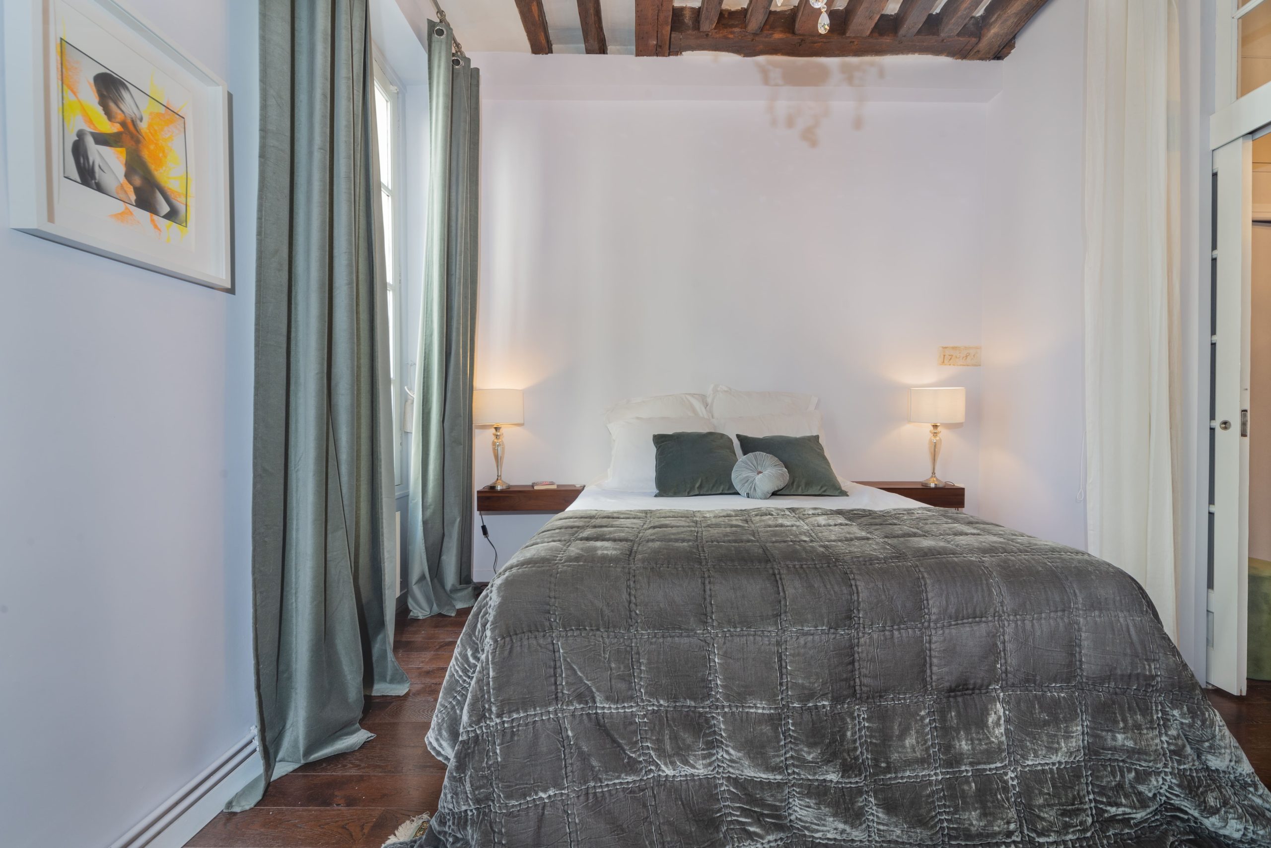 Clementine Marais is a gorgeous typical Parisian 1 Bedroom Apartment centrally located in Le Marais and steps away from Place de Vosges. This 1 Bedroom Apartment is situated in a second floor of a typical 18th century building with stone walls. Once you enter the home you feel you are in a French ''Chateau'' with bare stone walls in the entrance and wooden beams on the ceiling with dark wooden parquet floor.