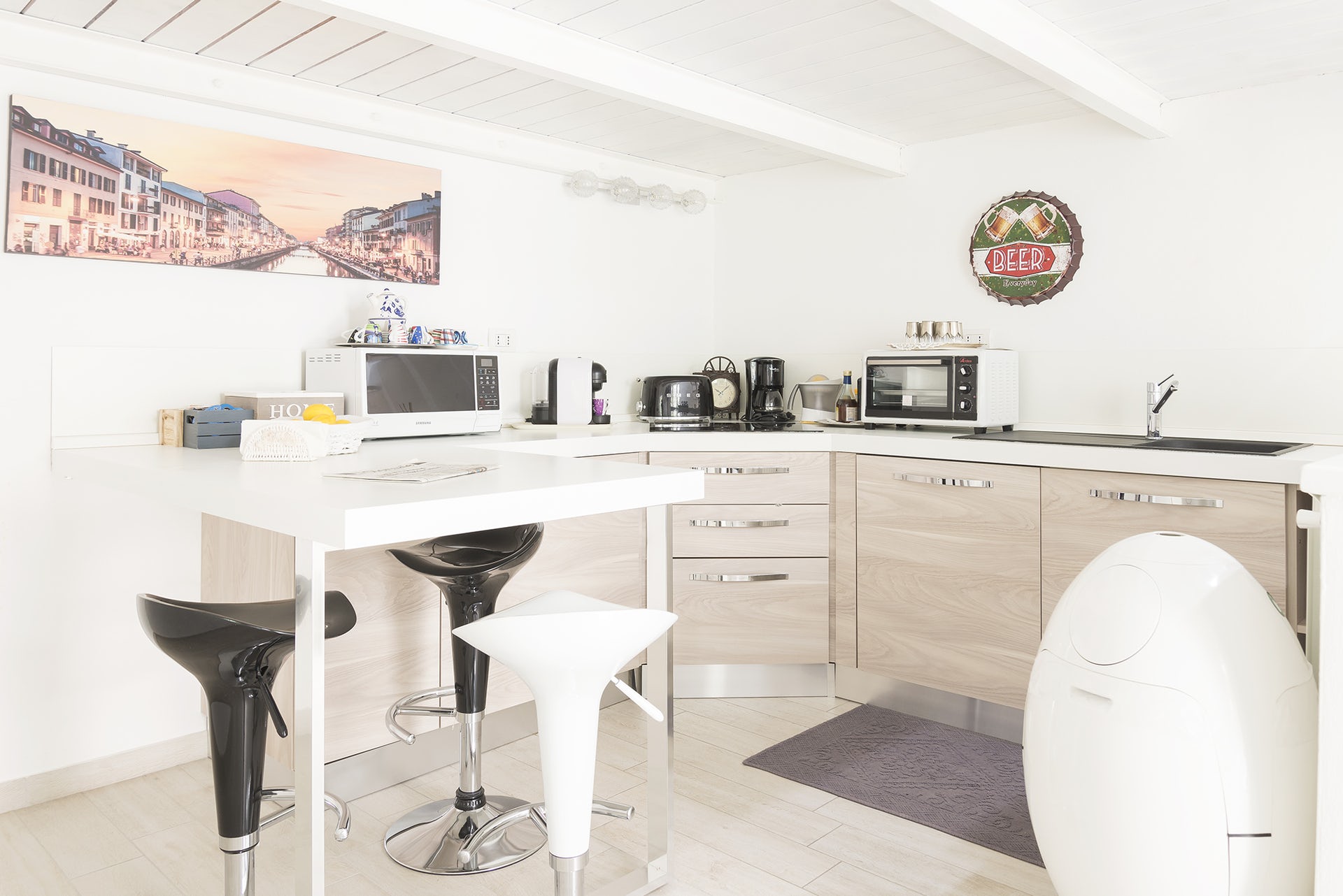 When you step through the gates and into the garden of this characterful property, you wouldn’t guess that you were in the middle of the lively Porta Romana neighborhood. Climb the spiral staircase of the three-story townhouse and you’ll discover an immaculate home flooded in natural light. We particularly love the conservatory on the first floor with an atmospheric dining area, and views out onto a pretty veranda that hugs the property. There’s also a private leafy patio below – the ideal place to host an evening soiree. Back inside, the white-washed bedrooms are spaced out across the three floors, giving the home a lofty feel and allowing for a little extra privacy for friends or families coming together. When it’s time to head out further into the city, the metro is just a five-minute walk away and then just three stops to the center. Or just enjoy the buzz of your local neighborhood – there are authentic patisseries, bars, and restaurants right on your doorstep. The past of imperial Milan has left its prints in the district of Porta Ticinese, where you can admire vestiges of Roman heritage. Nestled between the south of Duomo and Navigli, you can discover the old ruins and historic museums, or simply stroll around the colored building of the pedestrian zone by the Columns of San Lorenzo. The area has lost going on – there are tons of bars, nice restaurants, and designer shops, and it attracts a lot of young Milanese in the evening. In general, though, Porta Ticinese is characterized by its mix of types from the working affluent to the families.