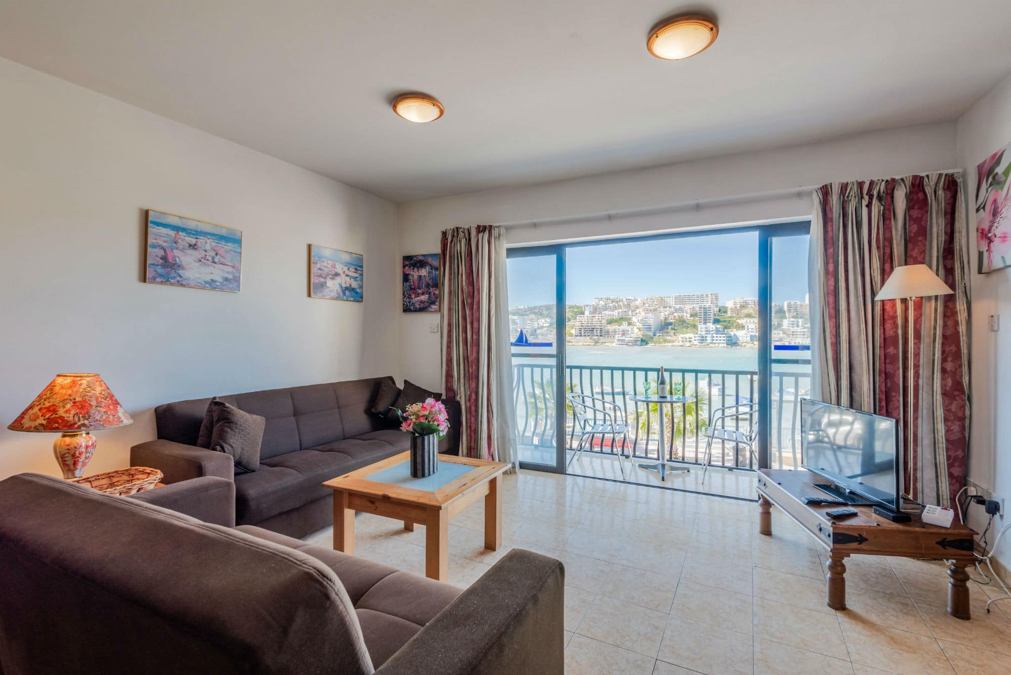 One of the most popular Malta Vacation Rentals with the best sea-view in Malta. Harbour Lights – Seafront self catering holiday 2 bedroom apartments are directly located on the Promenade. The apartment enjoys spectacular views and sunsets, looking out towards Xemxija and is only 4km from Golden Bay beach! The Harbour Lights apartments are in a quiet area of St Paul’s Bay. The more tourist areas of Bugibba and Qawra are 15 minutes on foot. Parking is much easier in this area and so ideal for those renting a car. However, the bus stop is just in front of the apartment block and reaching the North and South of Malta is easy as the bus stop is on the main bus routes. The fantastic view from the balcony and front room of this apartment is enchanting. Guests fall in love with the view and area and many return. The view at night of most seafront properties is pitch dark sea. This apartment enjoys the reflections in the sea of the lights of opposite Xemxija coast. Thus we named it Harbour Lights! This property also enjoys a small swimming area just 150 m away which is ideal for a quick swim after a day sightseeing or for a morning reviving swim! The apartment is also fully air conditioned it has two main bedrooms, one with a double bed and one with two single beds, shower room, and living room with a sofa bed. The kitchen is well equipped and the dining table is of the extendable type. Up to 6 people. Fast unlimited WiFi internet in all the rooms and TV with hundreds of Channels in different languages. Both are free of charge. The apartment block has 5 low steps at the entrance leading towards the elevator. The apartment is served with lift. Water and Electricity is included in the price with a sufficient weekly limit for your stay. 0.5m2 of water/person/week 150 kWh electricity/per week