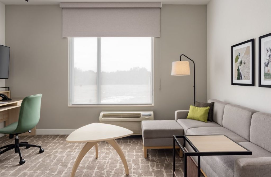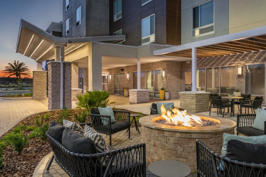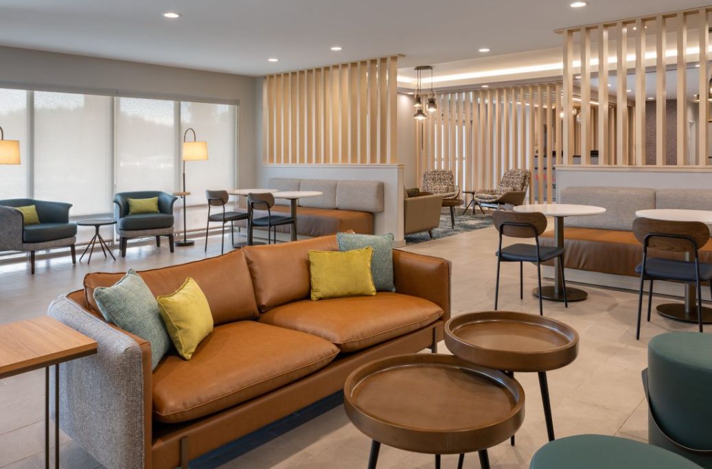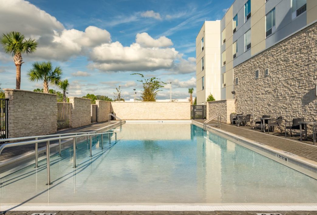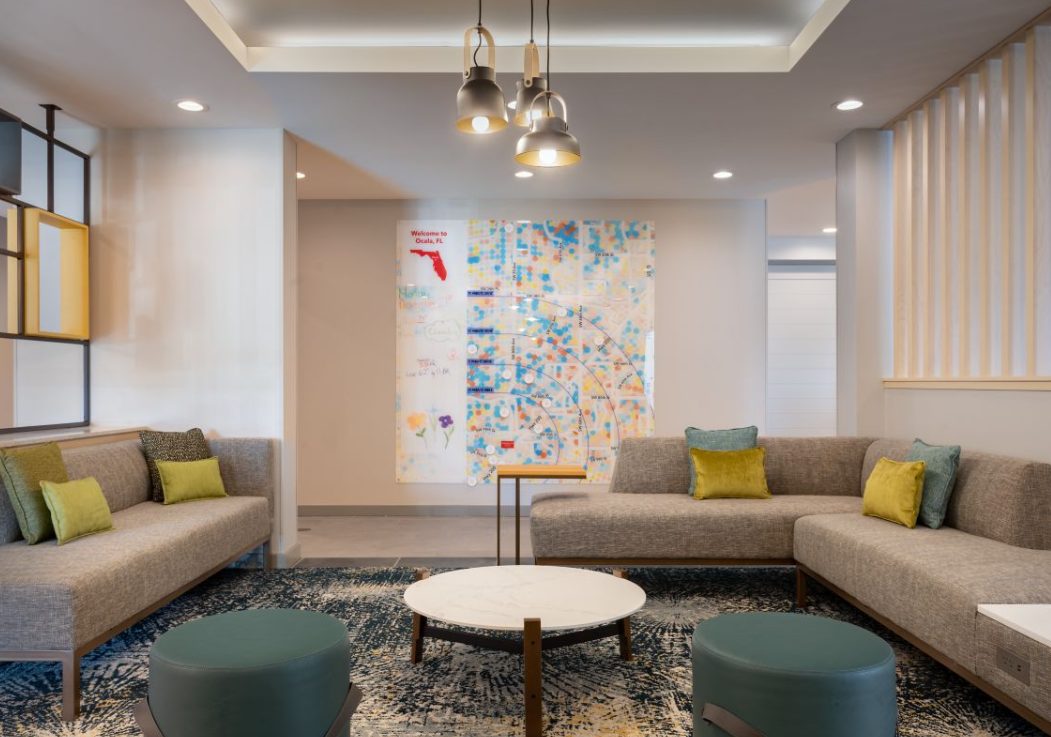 The TownePlace Suites Ocala is perfect location as we are minutes from World Equestrian Center (W.E.C), Florida Aquatic Swimming and Training Facility (F.A.S.T), and things to do in Ocala. Relax and unwind from your day and enjoy the Florida sun in our zero-entry outdoor saltwater pool. Upon entering the lobby, guests will be greeted with an inviting aesthetic of a warm color palette featuring soft neutrals and deeper tones, contrasting with pops of steel blue and muted turquoise. Elevated details like the built-ins and ceiling design parallel a residential design giving the hotel its home-away-from-home vibe. Our pet-friendly hotel offers spacious studio, one-bedroom suites with separate living and sleeping areas, comfy beds, and full kitchens. The addition the hotel offers complimentary Wi-Fi and Parking, SmartTV package with Netflix and Pandora Streaming capabilities, a complimentary full hot breakfast, and adjustable workspaces that are great for extended hotel stays in Ocala, Florida.