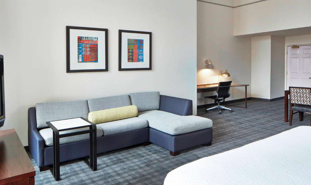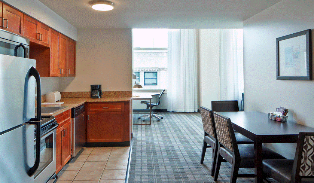 As your top choice for your extended stay needs, the Residence Inn Milwaukee Downtown boasts spectacular downtown and river views from our suites featuring 18 ft ceilings and full-length windows highlighting the dramatic downtown Milwaukee architecture. The function rooms compliment the hotel's host of current amenities for our guests needing to host meetings. Experience our spacious river walk view studio, one, and two bedroom suites offering full kitchens ready for your favorite cuisine. Start your day off right by enjoying our free complimentary hot breakfast, and take advantage of our free Wi-Fi, 24-hour fitness center, and guest laundry room. Our Downtown Milwaukee hotel is located on the Milwaukee River Walk, and steps away from the Milwaukee Public Market. The Fiserv Forum, and the Miller Theater are a short walk. American Family Field, and the Milwaukee County Zoo are a short drive.