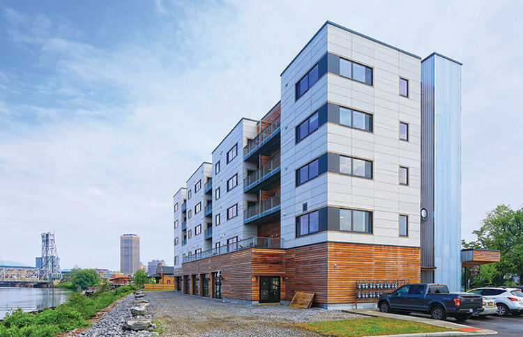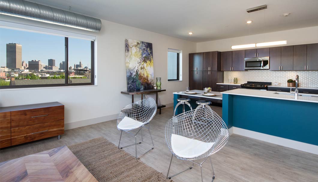301 Ohio Street is located along the Buffalo River among the emerging Ohio Street Corridor. Offering a new build in a former industrial area, this 5-story, 52,000 square-foot building consists of twenty one upscale apartments and 10,000 square feet of office space with abundant on-site parking. The building exterior highlights a modern industrial design featuring concrete panels, wood planks, and corten-weathered steel cladding. Apartment units feature outstanding modern interiors and luxury amenities with balconies offering spectacular riverside views and Lake Erie sunsets. Get the most out of your stay in Buffalo at 301 Ohio Street.