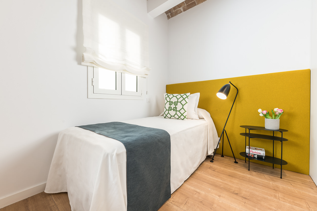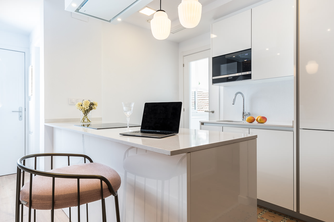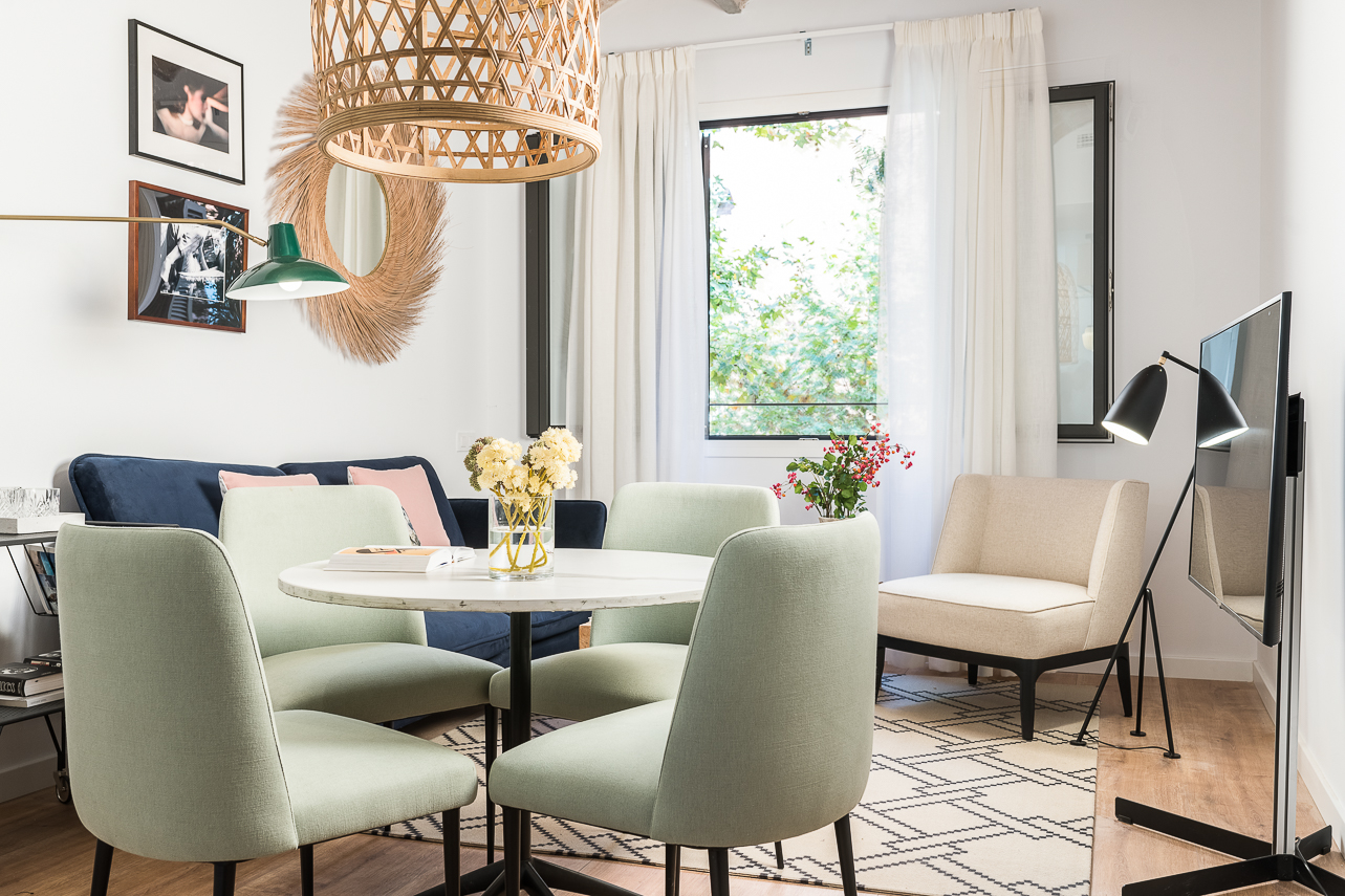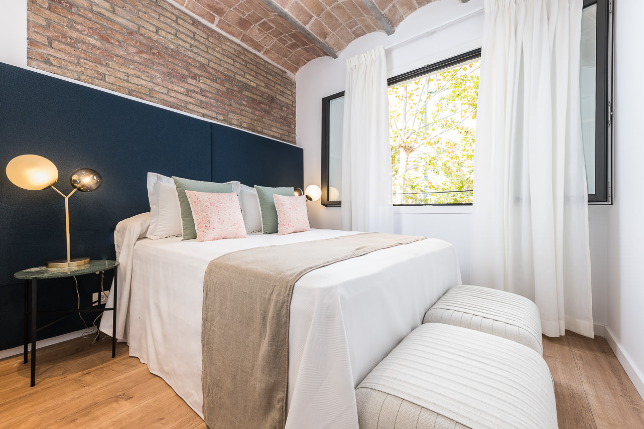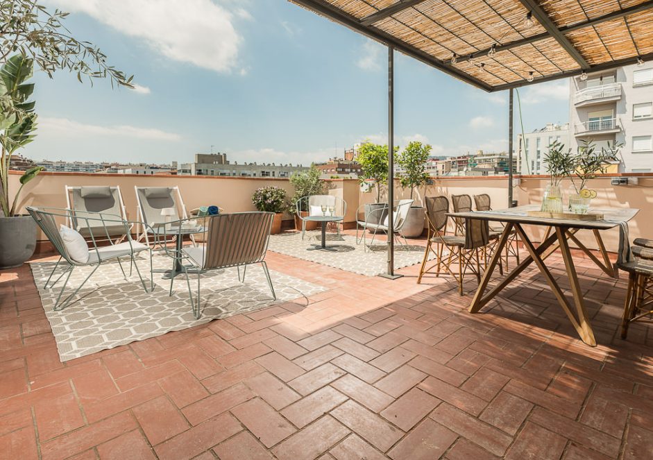 This large modern apartment (90m2) comes with 1 bedroom in a fantastically located area in Barcelona. You will find yourself in the central and prestigious Les Corts district which ensures you are in a vibrant and authentic atmosphere. There are plenty of cultural events and must-see landmarks in the area that make this location even more exclusive. The top floor of this building comes with a huge corner terrace (14m2) common area, completely decked out with furniture that offers stunning sweeping views over the city, perfect for sharing a drink with friends and enjoying the good weather. Inside, the apartment is fully decorated with excellent comfortable furniture for your stay. With contrasting light and dark tones throughout, which are complemented by the rustic exposed brick wall which really makes this apartment stand out. The apartment comes with a smart, combined lounge area that takes full advantage of the space. It is fully decorated with artwork and stylish sofas/chairs to make this your home away from home - whether it’s for a short or long stay in Barcelona. There is another private terrace that you can walk out onto the living room. Out here there is some cozy outdoor furniture, ideal for warm evenings.