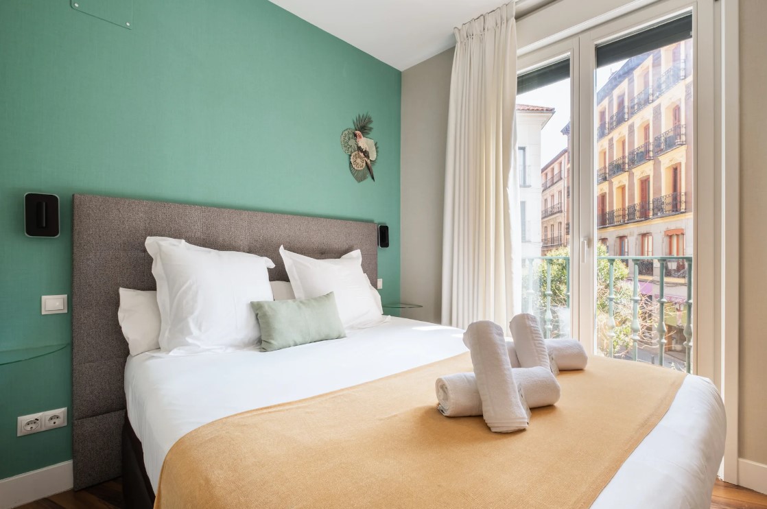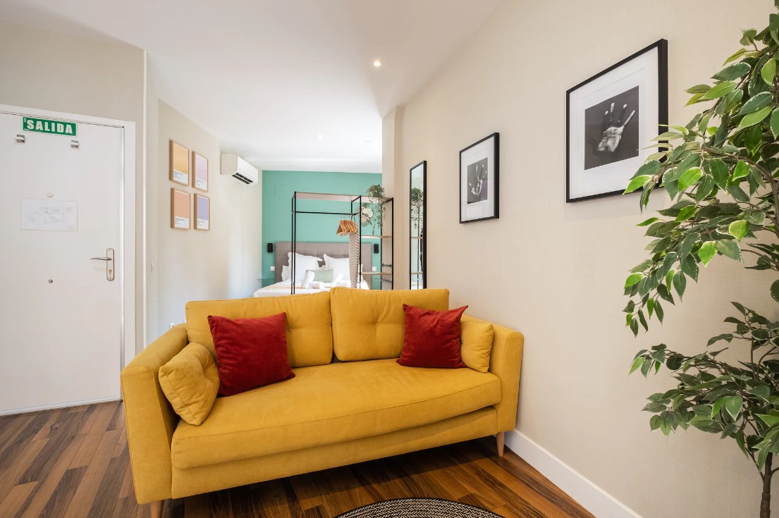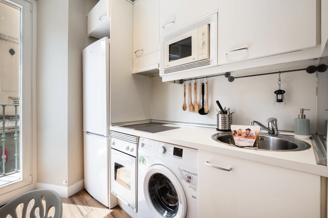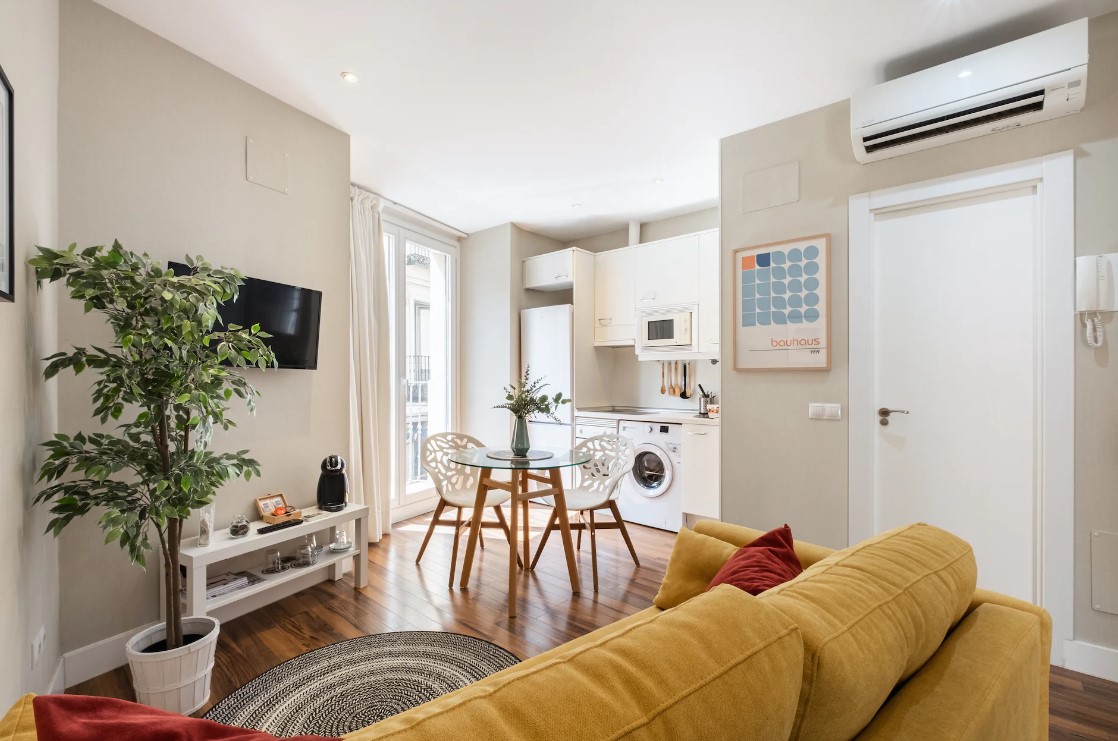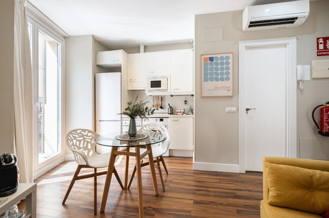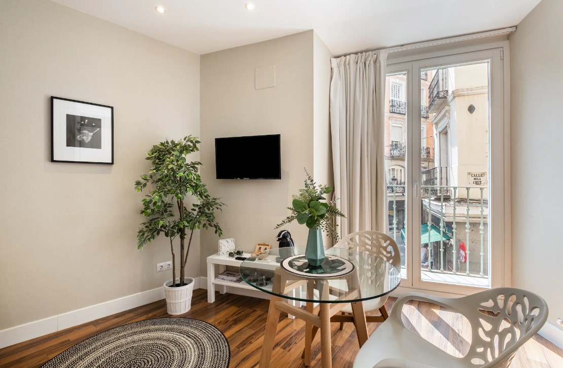 This cosy studio is in the perfect spot for a city break, located in the heart of Madrid and close by to Calle de la Cruz. It's a great stop-off point to recharge your energy and put your feet up before another adventurous day out. Tuck into a light breakfast at the dining table by the balcony door, followed by enjoying a toasty cup of coffee as you watch the locals go about their daily routines on the streets below.