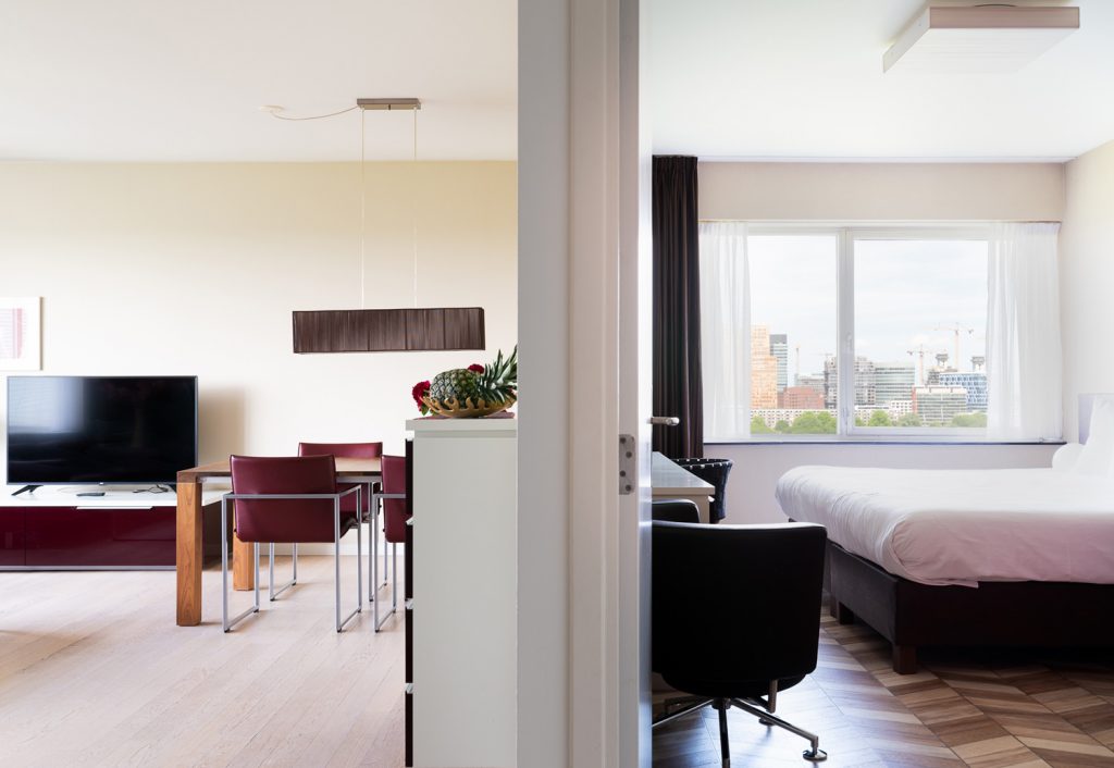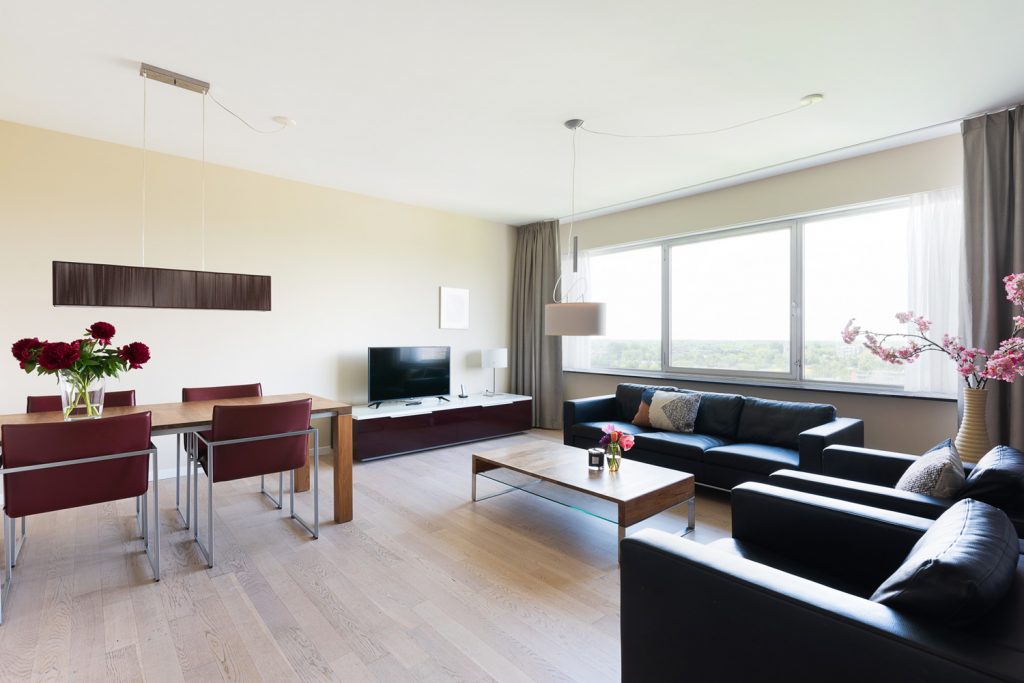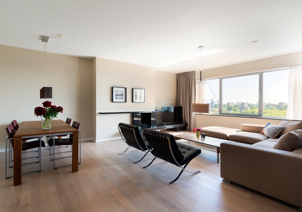 Step into the luxurious apartments of Teilingen Residence and feel at home immediately. The apartments are beautifully furnished and tastefully decorated with enough space to add a personal touch. The apartments on the higher floors enjoy a wonderful view of the green surroundings of Amsterdam Buitenveldert. Upon entering the beautiful entrance hall, you will receive a friendly greeting from the concierge, who will available during the day if you need anything. In addition, residents of Teilingen Residence can use the gym on the second floor. Home cooks can practice their culinary skills in the modern kitchen – fully equipped with all essential items. The bedrooms boast wonderful hotel-quality beds and the bathrooms are luxurious and modern. The apartments are also equipped with a washing machine and a dryer. The crowning glory of Teilingen Residence is the luxury Penthouse (262 m2) located on the 15th floor with a spectacular 360° panoramic view.